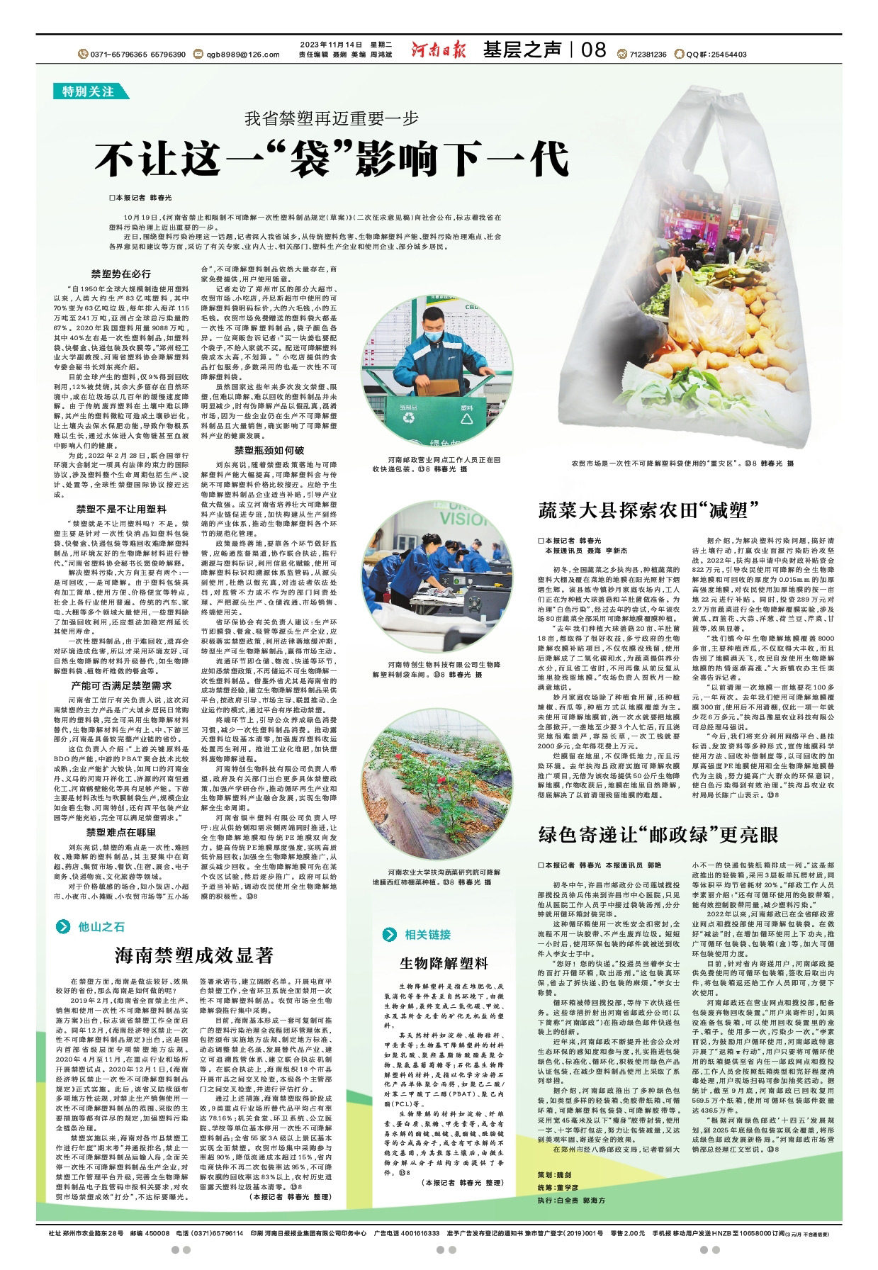 一次性可降解塑料袋、地膜、快遞外包裝、可降解餐盒……如今,該企業利用玉米、甘蔗渣、咖啡渣等農作物制成的可降解塑料制品,暢銷30多個國家和地區。在國內,中國郵政、京東、順豐、丹尼斯、大潤發、美團、唯品會等該企業重要合作伙伴使用的塑料袋都是“浚縣制造”。