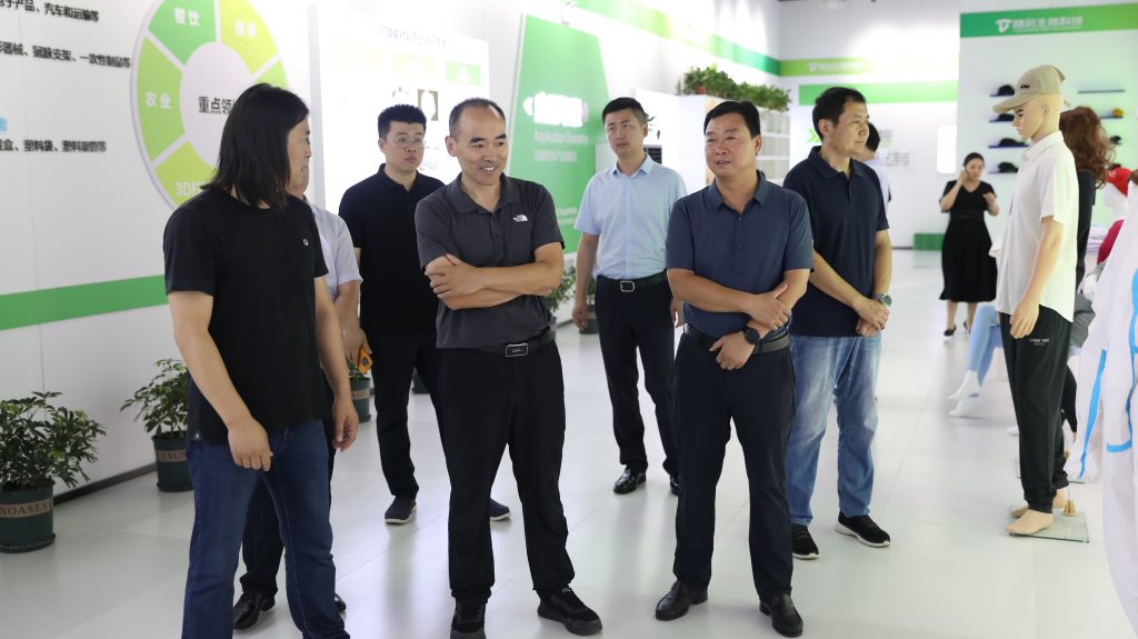 在公司領導的陪同下,魯軍董事長、程小軍行長一行首先參觀了公司的產品展廳、研發中心,近距離感受了河南特創在生物基可降解領域的創新成果。通過現場講解與演示,考察團對河南特創在技術創新、產品研發及市場應用方面的能力有了更加直觀和深入的了解。